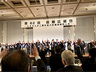 近畿在住の島根県出身者が集う「近畿島根県人会」の総会・懇親会が、石見西部の市町村人会の担当で開催され、382名が参加しました。近畿松江会からは会員22名(役員16名)が参加し、松江市からも講武副市長はじめ10名のご来賓が出席されました。 第一部「総会」は、千家敬麿会長のご挨拶に続き、議事が行われました。県人会の副会長を務める当会の松本耕司会長も登壇し、議案は滞りなく承認されました。 第二部「懇親会」は、丸山達也島根県知事よりご祝辞をいただき、近畿在住で県政に功労のあった方々へ知事より表彰状が贈呈されました。 乾杯のあと、ステージでは演歌歌手の山崎ていじさんの歌や、高津神楽社中による「石見神楽」が披露されました。宴席では丸山知事が各テーブルをまわられ、参加者と親しく接し、記念撮影にも応じていただきました。 宴も終盤、浜田市出身の梨田昌孝元野球監督が登壇され、参加者全員で島根県民の歌「薄紫の山脈(やまなみ)」と「ふるさと」を合唱しました。 最後に、来年の担当となる松江・安来・奥出雲の代表が登壇し、実行委員長となる当会の松本会長の音頭で万歳を三唱して締めくくりました。 |