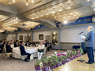 景山克雄副事務局長の司会で懇親会が開会し、ご来賓を代表して近畿島根県人会会長 千家敬麿様、名誉会員の三林京子様からご祝辞をいただきました。 「福引き大抽選会」が始まり、茂居理智子常任幹事と内部茂副事務局長の進行で、ご来賓の方々や松本会長が抽選を行い、牡丹の鉢植えや松江の特産品が参加者全員に当たりました。 |